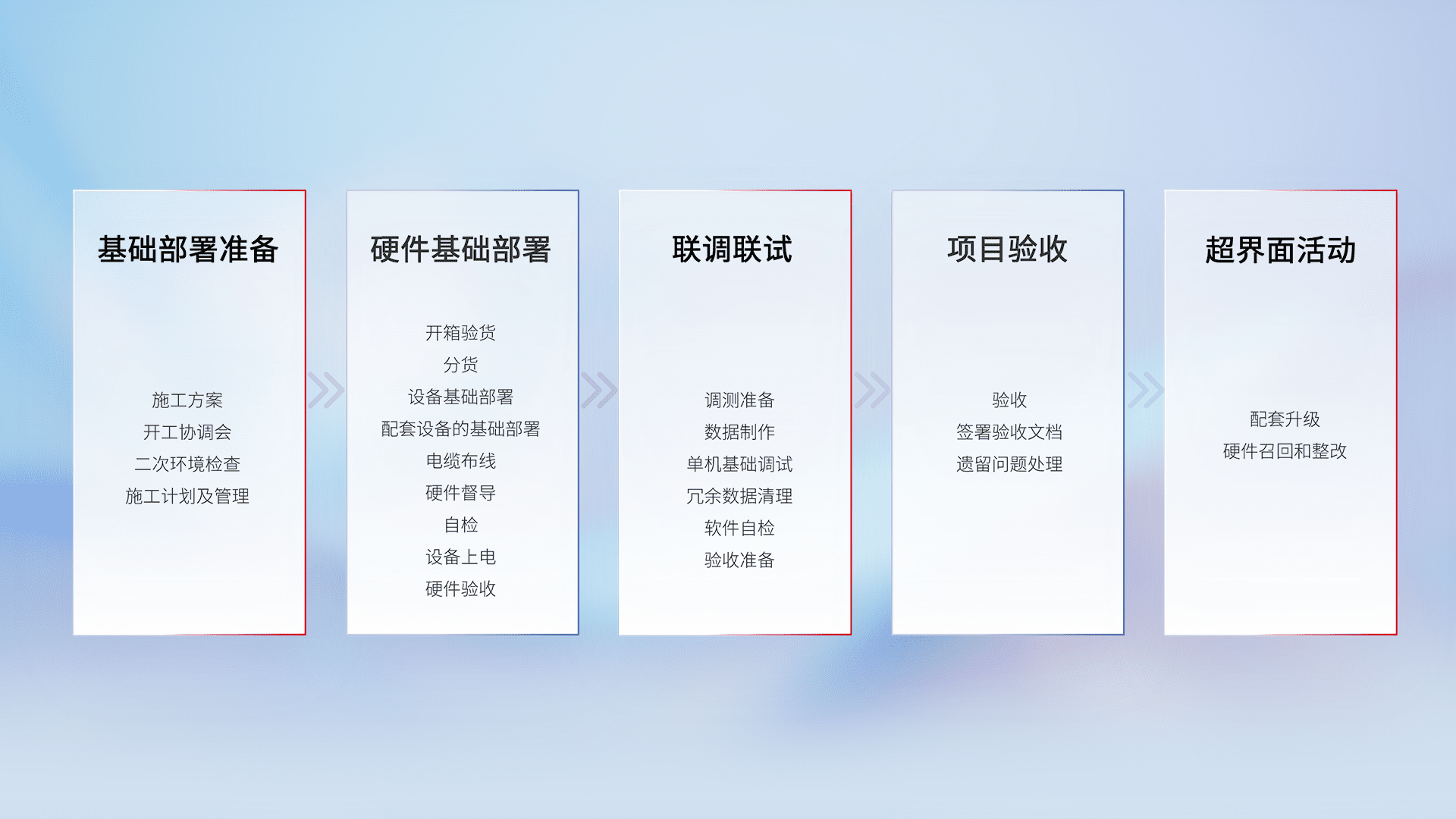 从基础部署准备、、、硬件基础部署、、、联调联试、、项目验收、、、越界面活动的全过程可追溯,,,,保证施工质量和进度。。。。